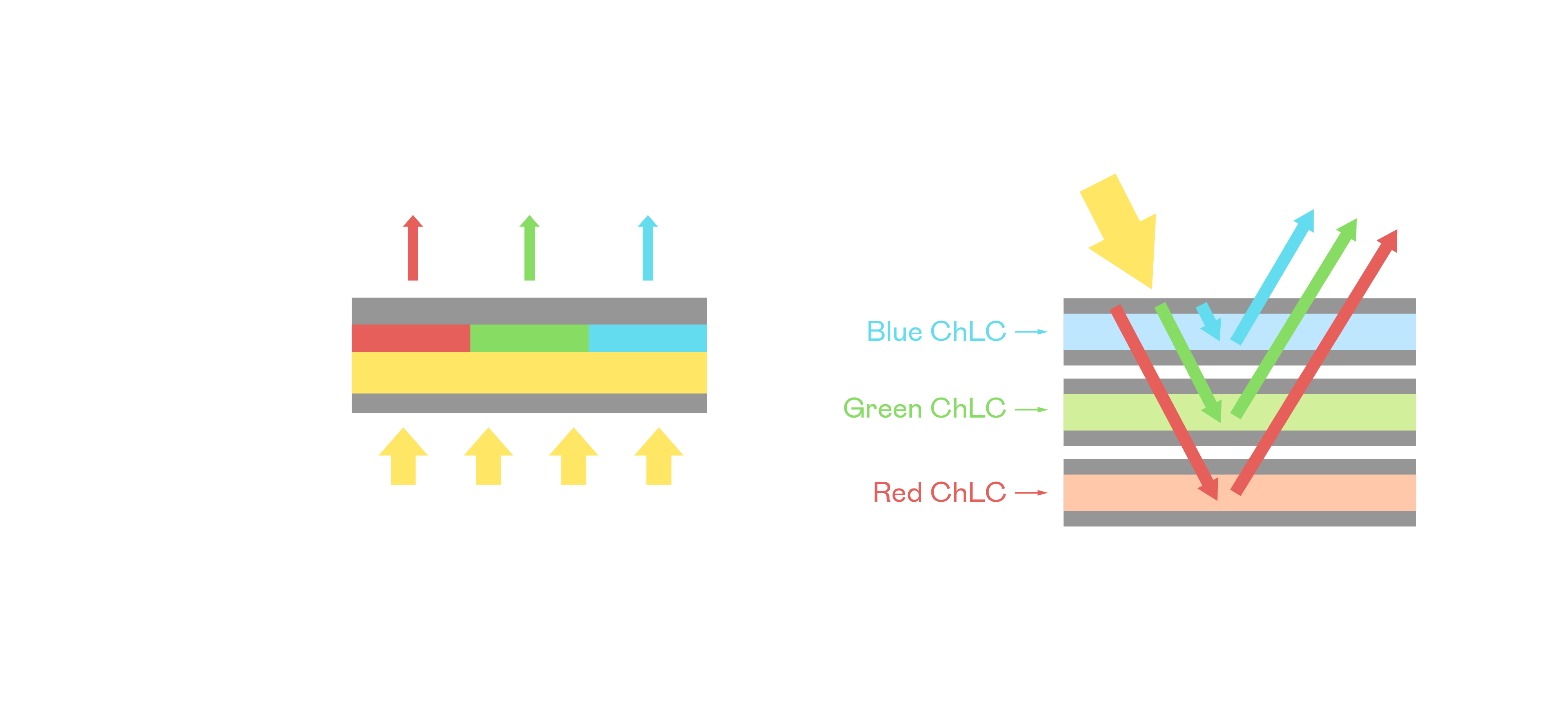 918博天堂膽固醇液晶顯示器是由紅、綠、藍三層膽固醇液晶面板堆疊而成,並採用無彩色濾光片設計,減少環境光在反射過程中的損耗。